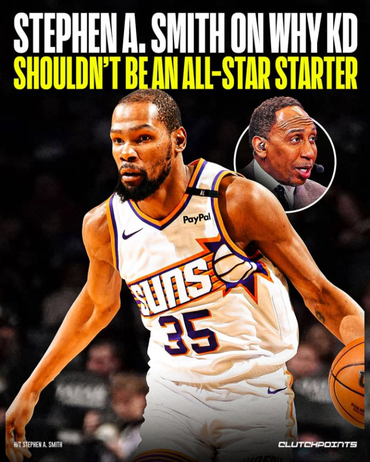 对此,NBA名嘴A-史密斯在节目中表示杜兰特不该首发,他说道:“凯文-杜兰特是联盟中的超级巨星,他绝对是非常出色的。我们都知道。但他本赛季缺席了10场比赛,并且太阳排在西部第十(实际是西部第八),他们本赛季的战绩没有那么出色。所以对我来说,杜兰特应该打替补。”